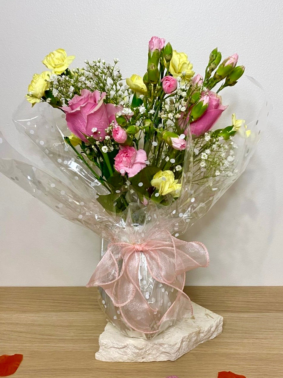These fresh flower bouquets are the perfect add on to pretty up any hamper purchase. All bouquets come with a vase and are wrapped and delivered as pictured.